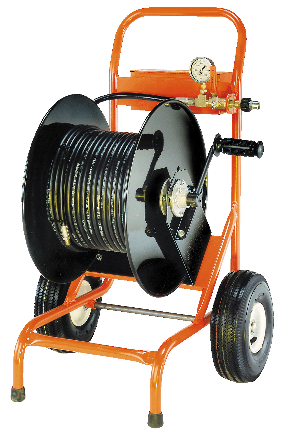 The optional Cart-Reel is a must for professionals. It lets you use the power of the gas-powered sewer jetter in buildings and confined spaces where exhaust fumes could be hazardous, while the water jetter stays safely outside. The Cart-Reel comes with two “Flat-Free” foam core tires, 300 ft capacity hose reel, reel brake, gauge, and a shut-off valve. (Cat. CM-300) The sewer jetter hose is sold separately.